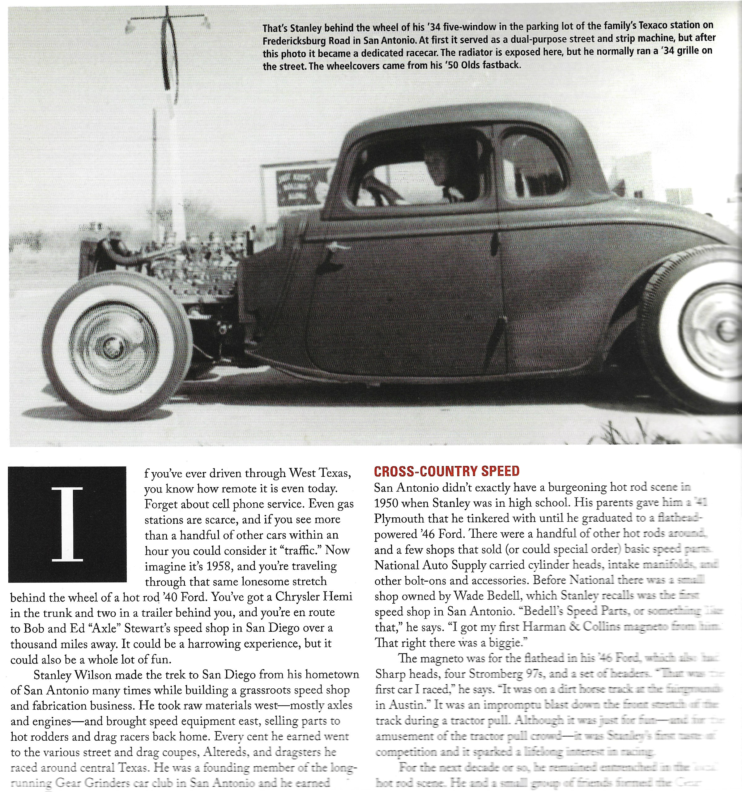 The following magazine article is about Stanley Wilson during the 1950's. The article is incomplete but still interesting. Click the photo to open in a new window to read the article. The next photo was featured in a magazine. I re-typed the print as the scan I had wouldn't be legible. Click the photo to enlarge in a new window. This mid-'60s photo of the Gear Grinders car club was taken in the parking lot of the Wonderland shopping center in San Antonio. Stanley wasn't with the club that day. Kneeling to the right of the front wheel of the asymmetrical custom Thunderbird is Kit Carlisle. At the far right of the photo is Eddie Baumann. Bill Mano, seen standing with the plaid shirt, worked at a local Chevy dealer and equipped his 39 Chevy (pictured) with a smallblock and a four-speed. Directly in front of the Chevy's grille with the young boy on his knee is Will Hodges, and to his right is Sonny Bippert, one of Eddie Baumann's Top Fuel crew members. The Gear Grinders also joined a handful of other area clubs to form the Alamo Timing Association, which organized occasional races at an abandoned airstrip called Martindale Field.